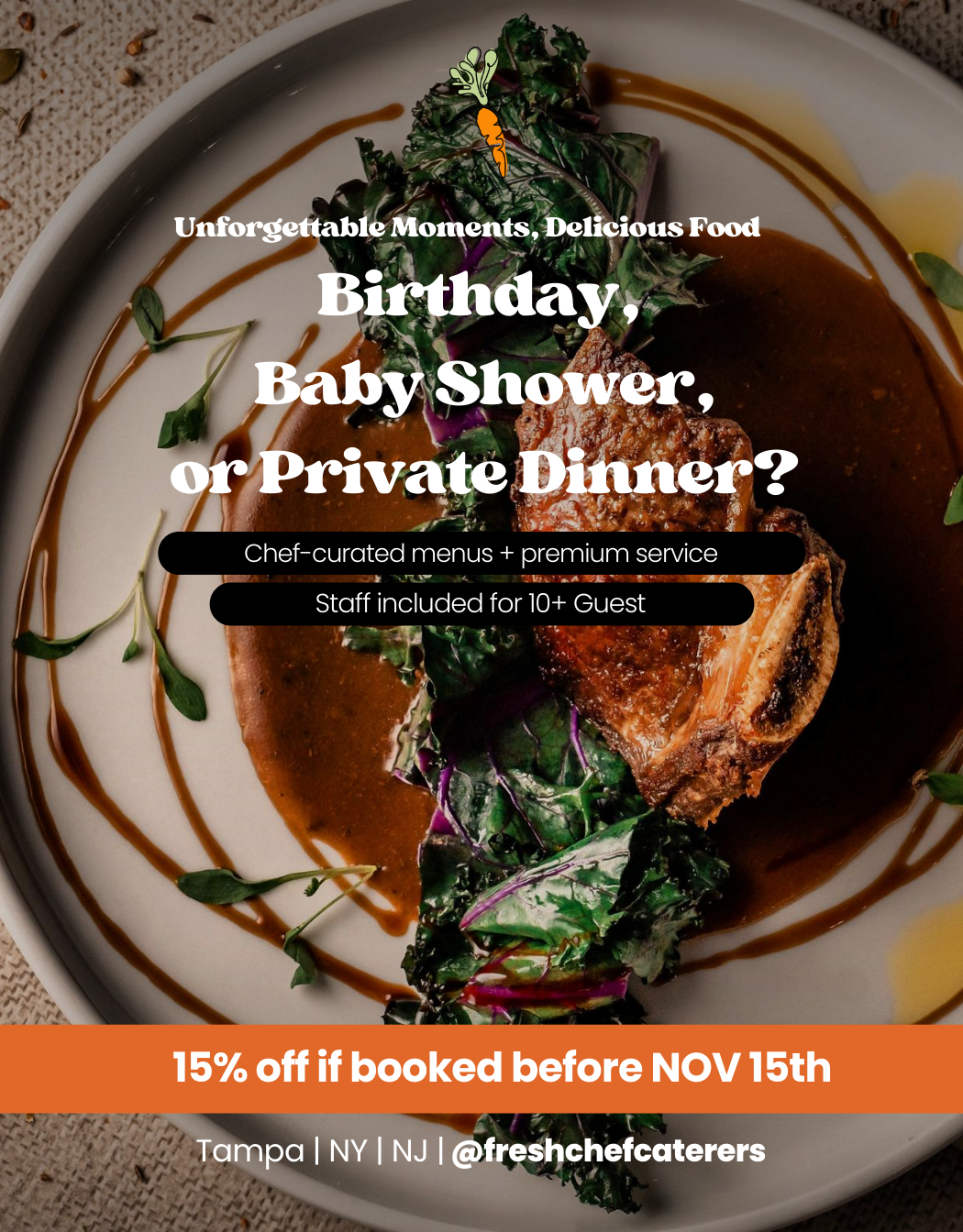 At Fresh Chef Caterers, every event is more than a gathering — it’s a memory in the making. Guided by our team of passionate chefs and event professionals, we deliver affordable luxury through bold flavors, elegant presentation, and seamless planning.